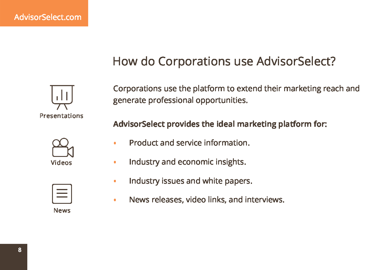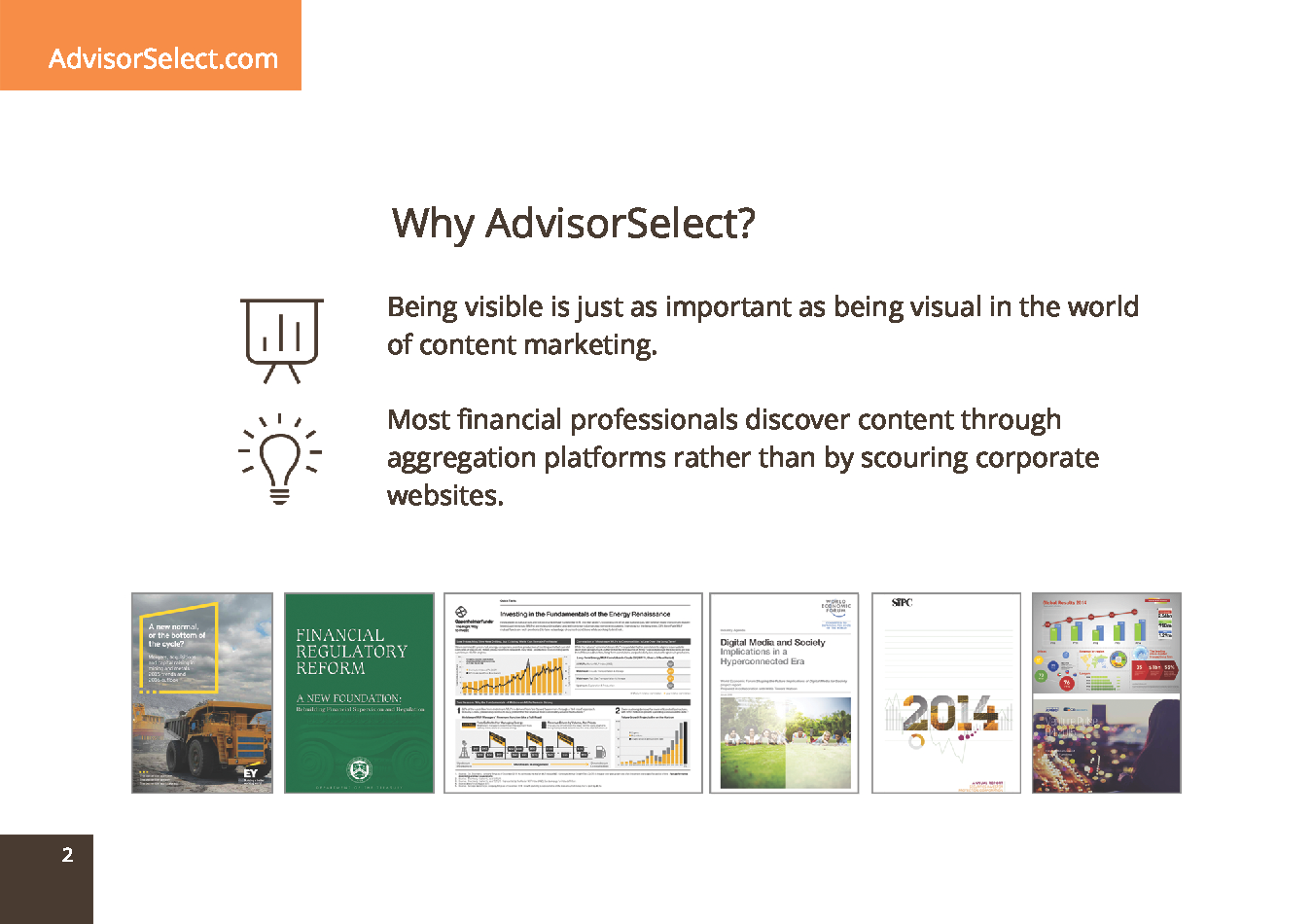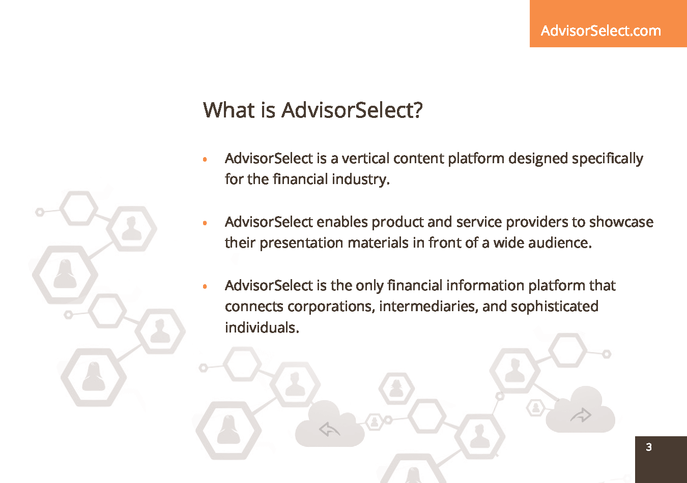 AdvisorSelect is a content sharing platform designed specifically for the financial industry that enables product and service providers to showcase their presentation materials in front of a wide audience.