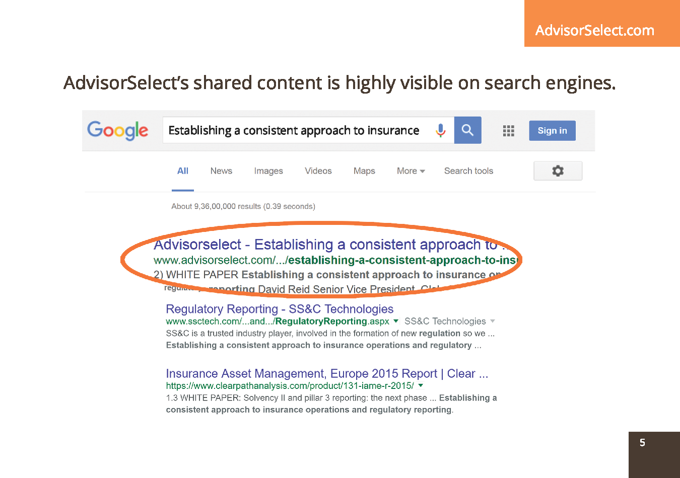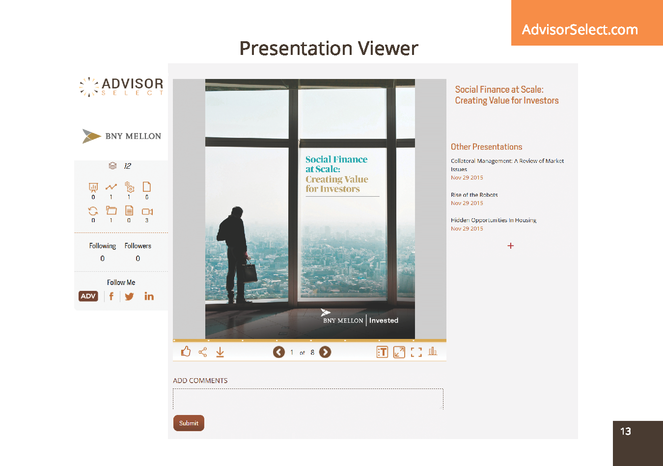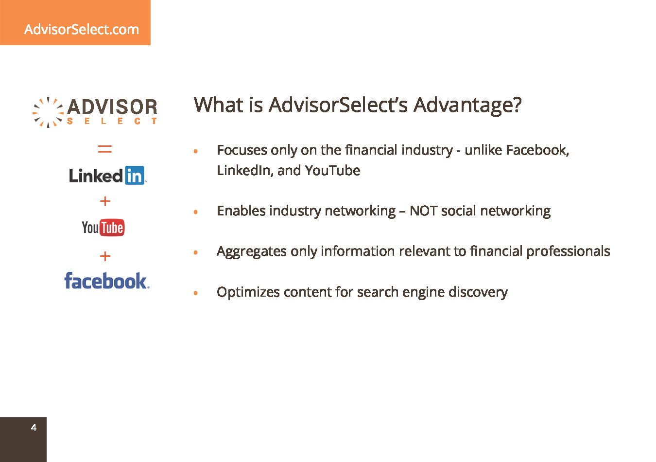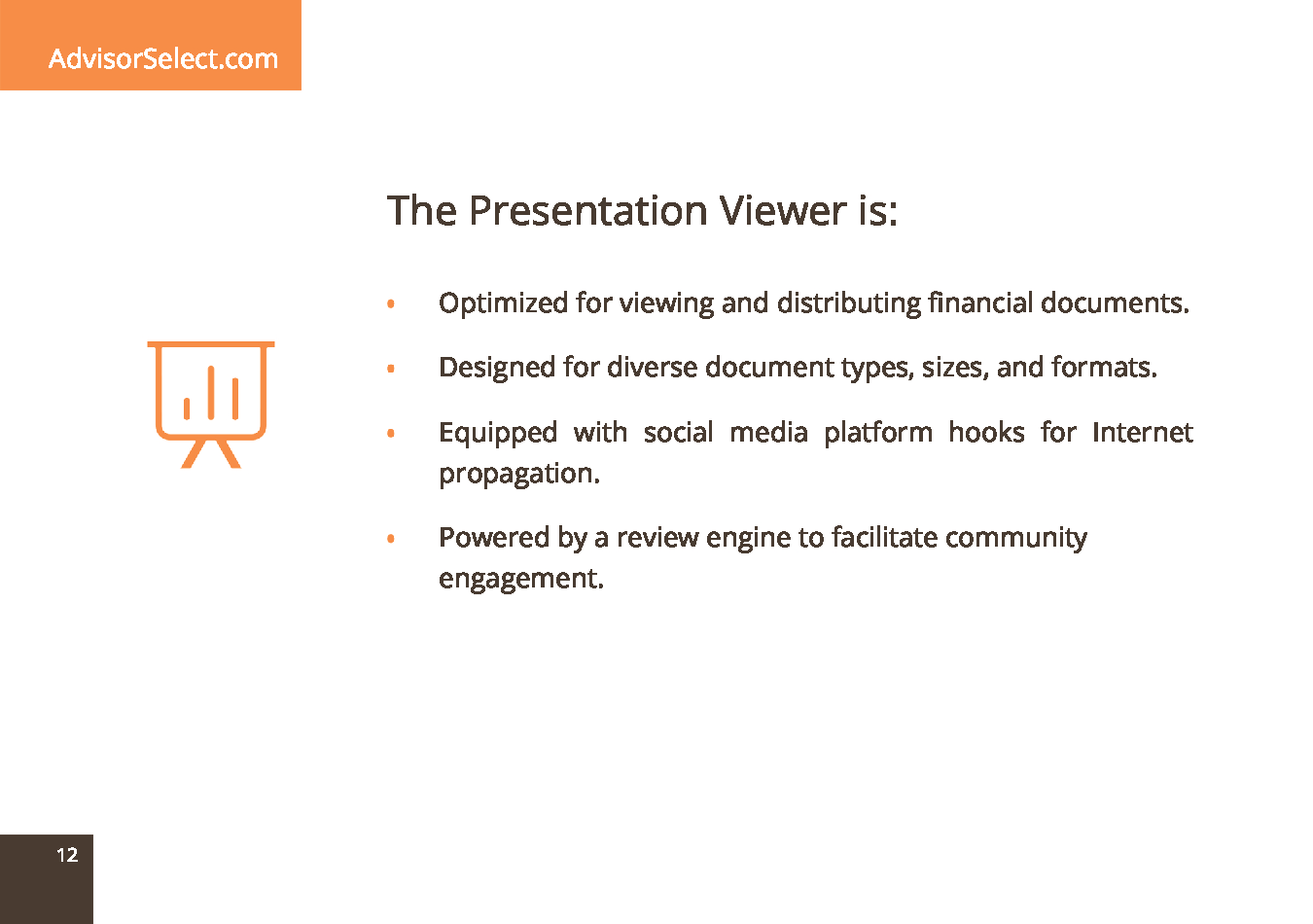 AdvisorSelect is a content sharing platform designed specifically for the financial industry that enables product and service providers to showcase their presentation materials in front of a wide audience.