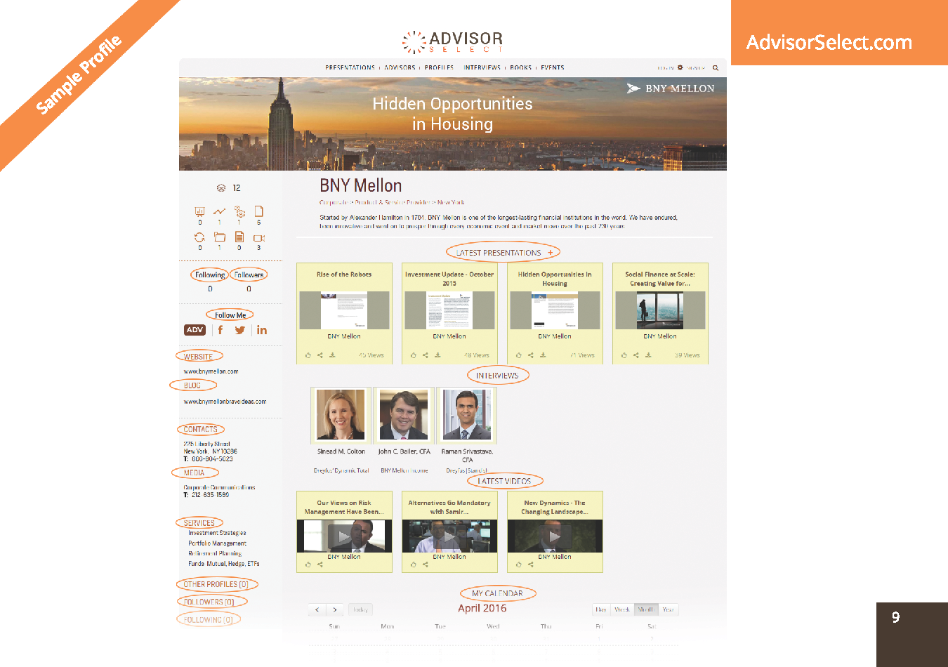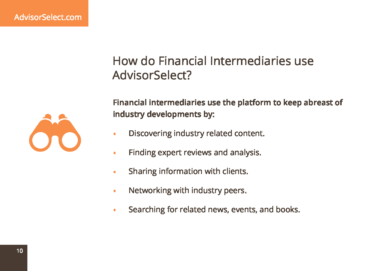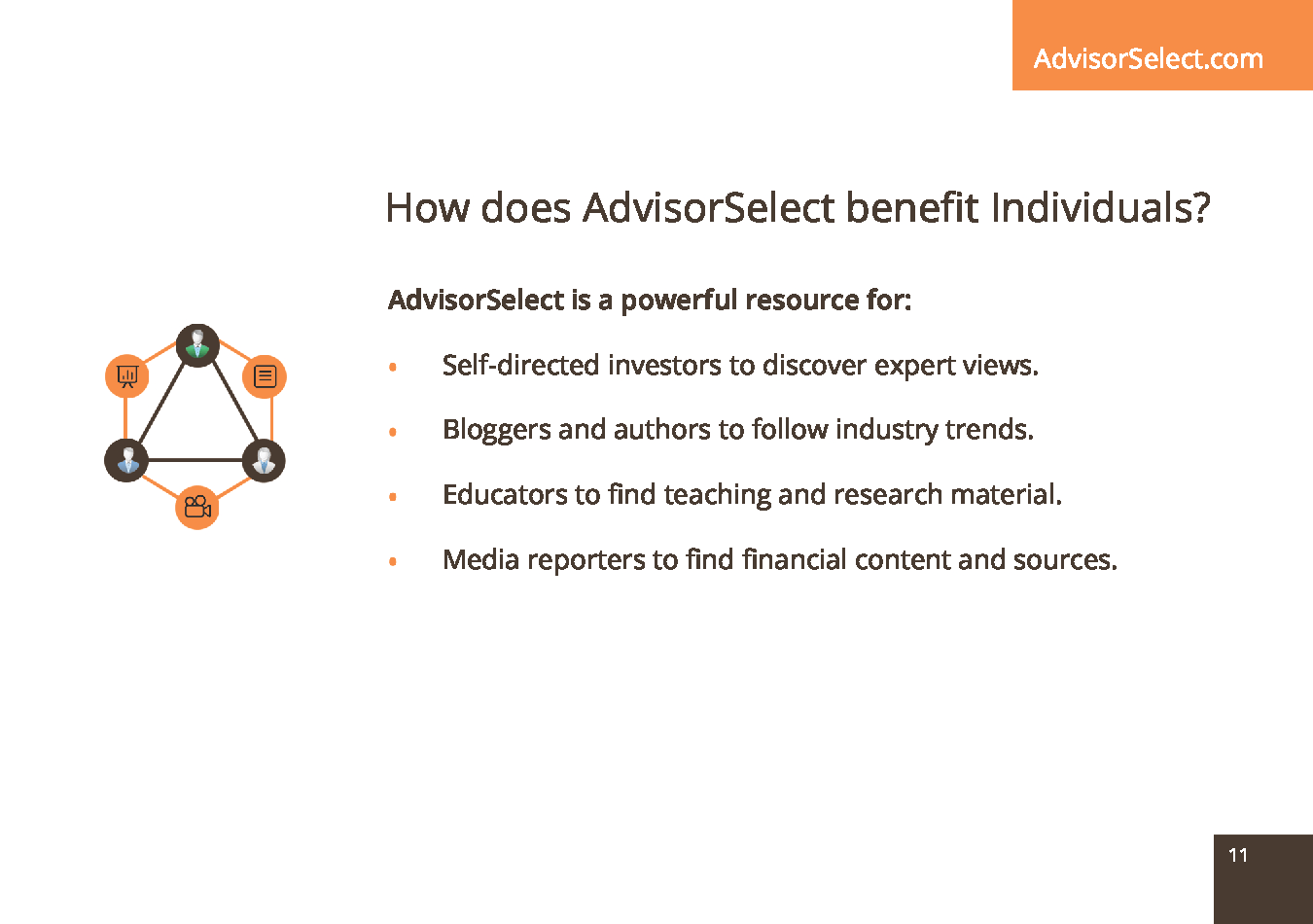 AdvisorSelect is used by financial professionals and sophisticated individuals to keep abreast of industry trends and developments. Financial services providers use the platform to extend their marketing reach and identify useful contacts.