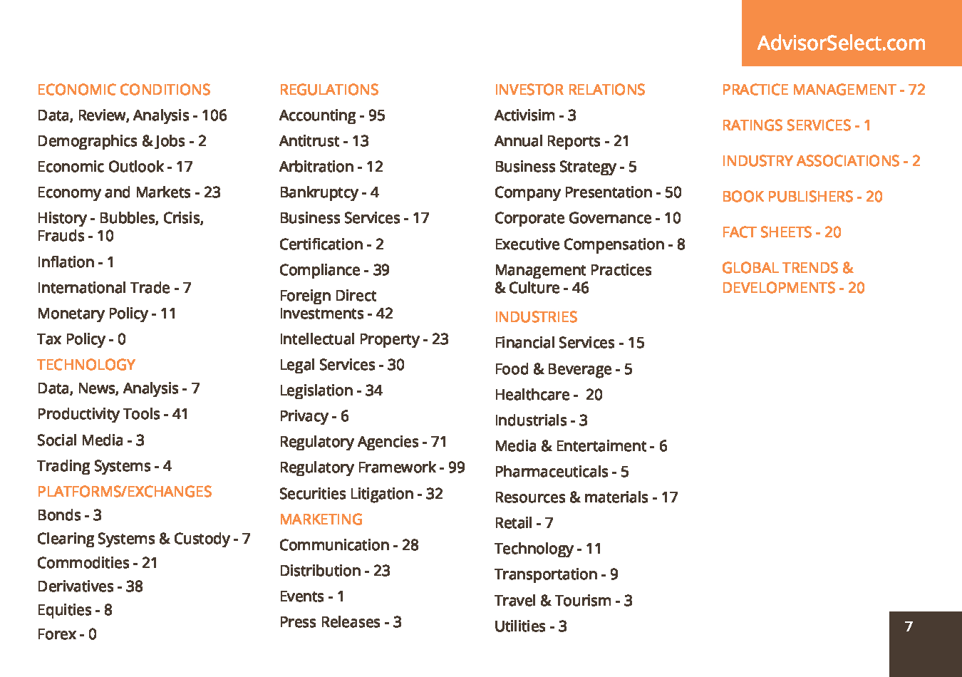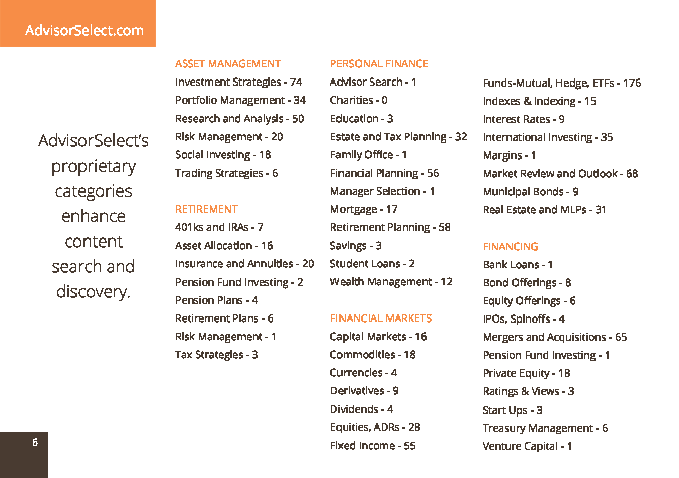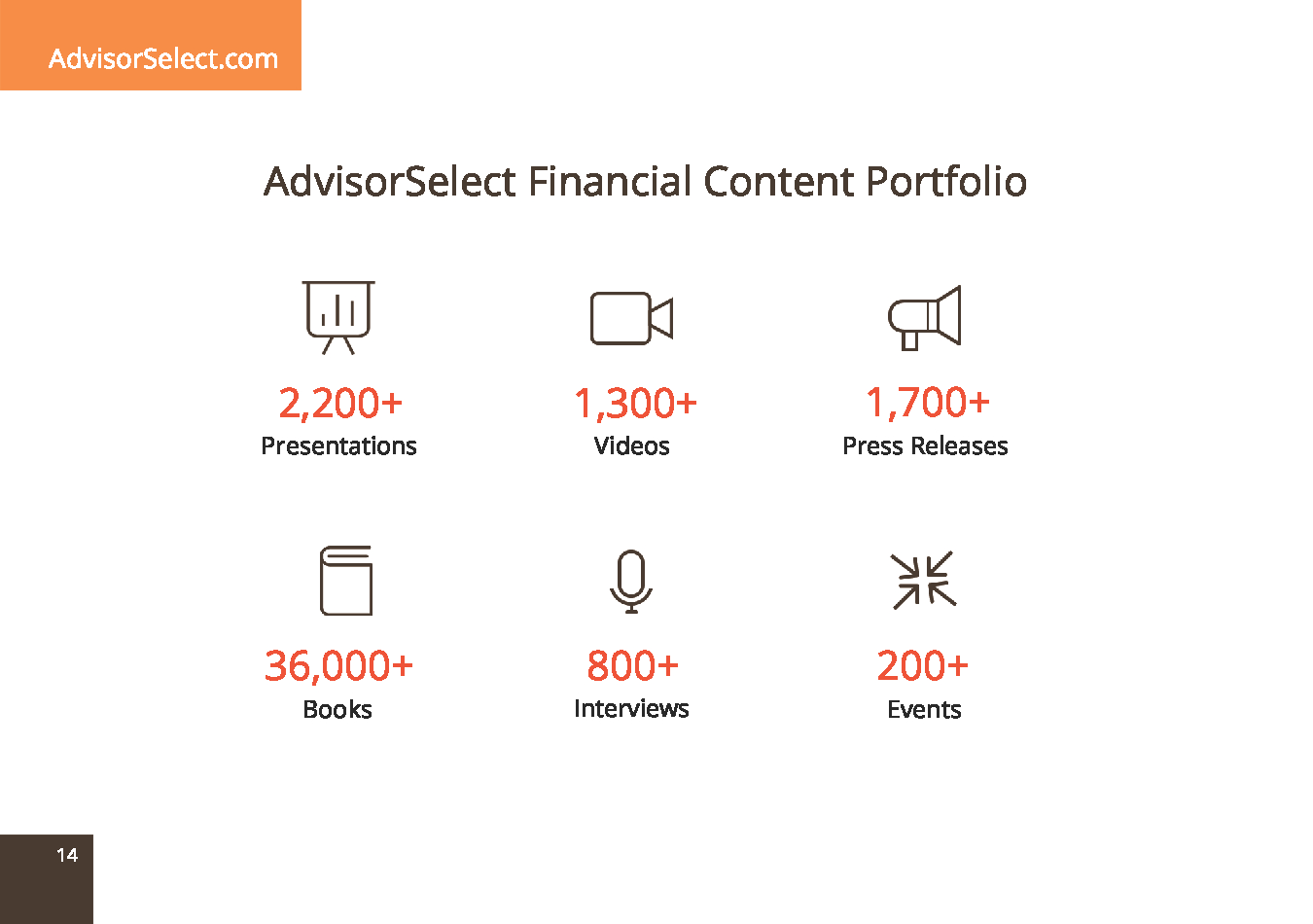 AdvisorSelect is an open, searchable platform offering a wealth of financial presentations, interviews, and books organized by category and topic. By aggregating unique and relevant financial content, AdvisorSelect simplifies your search and discovery task.